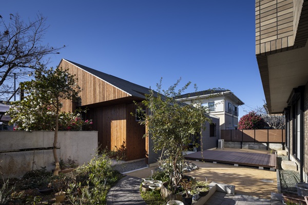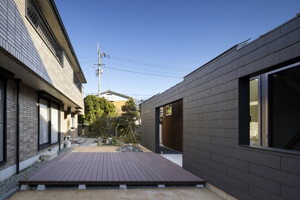 実家との関係性を踏まえ、両家で共有できるデッキの庭を住まいの中心的な外部空間として据えた。