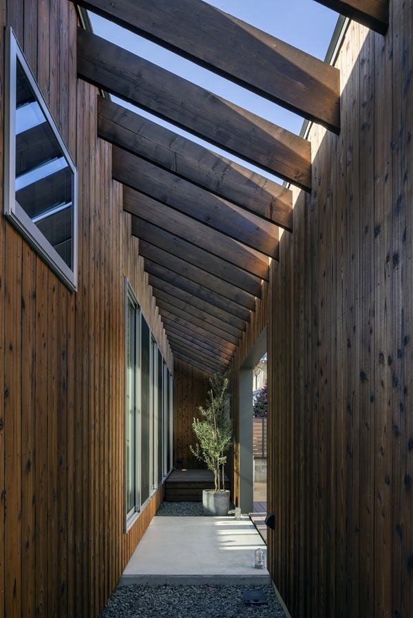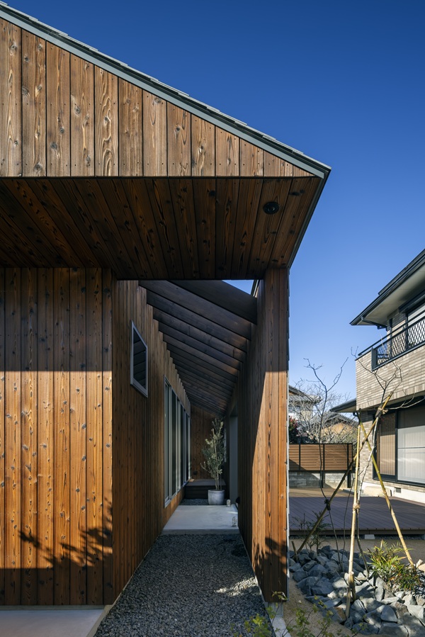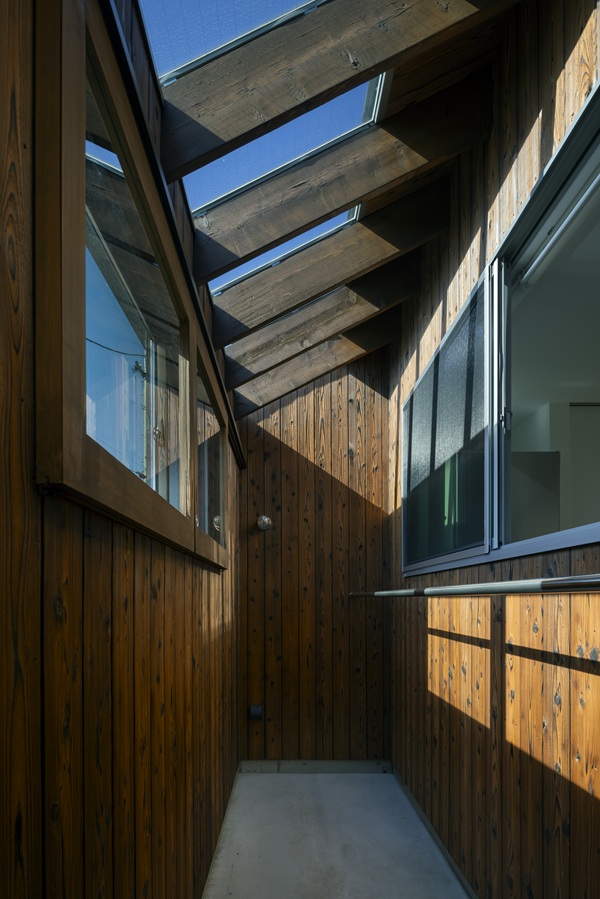生活の裏側を包み込みながら、建築全体に採光と通風の奥行きを与え、内と外の境界を単純な線ではなく、重なりをもった層として立ち上げている。