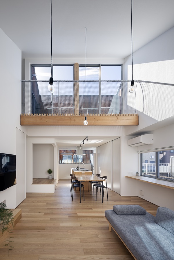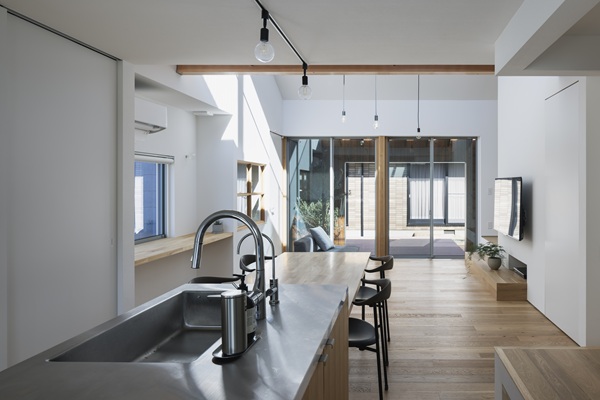 その条件を単なる制約とせず、南側に設けた吹き抜けや中間領域を介して光を導き、回し、拡散させる構成とした。