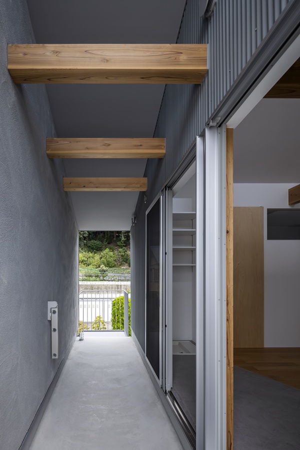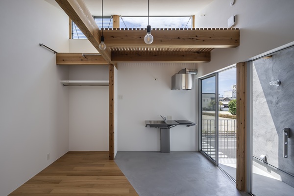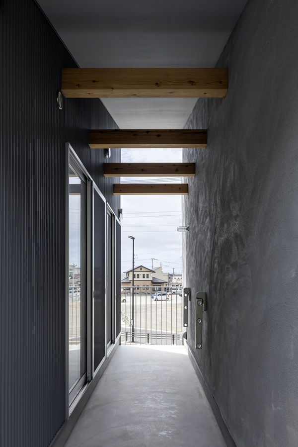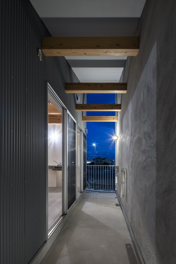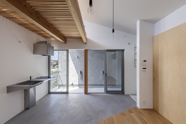 各住戸前に設けた専用土間は、内部と外部の間に位置する緩衝領域である。明確な用途を固定せず、住まい手の使い方に委ねる余白として計画している。住居としてだけでなく、仕事や活動の拠点としても成立し得る構成とすることで、単一用途に閉じない空間の可能性を持たせている。