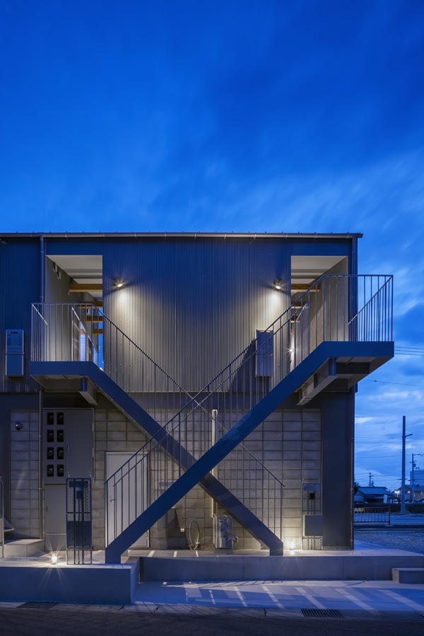本計画の大きな特徴は、各住戸に専用階段を設けた点にある。一般的な賃貸住宅では、共用階段や共用廊下を介して各住戸へアクセスする形式が多いが、本計画ではそれぞれが独立した動線で2階へ上がり、専用の土間空間を経て住戸内へ入る構成とした。